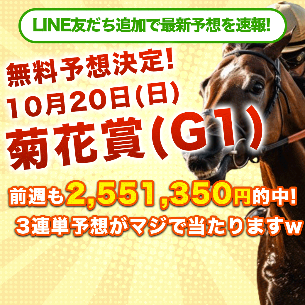 【菊花賞(G1)無料予想確定!】現在最注目の最新競馬予想サイトです。オープン直後から3連単予想を連続して的中させているこのサイトですが、ここは完全ポイント制でしかも毎週5レースの無料予想が提供されるので安心して利用でき、競馬初心者の方には特におすすめです。LINE登録できるので気軽に試してみるのが良いでしょう。